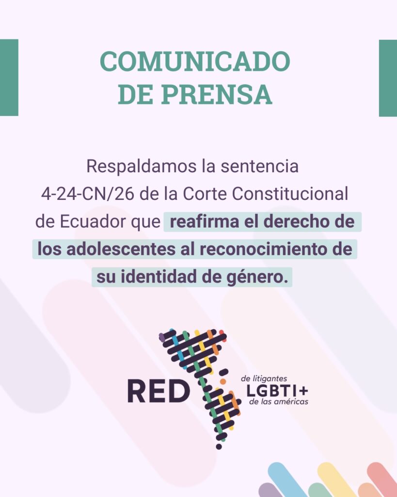He 10 March 2026 la Corte Constitucional de Ecuador hizo pública la sentencia 4-24-CN/26, en la que conoció el caso de un adolescente de 15 años a quien el Registro Civil de Ecuador denegó la solicitud de modificación del componente género en su documento de identidad, la cual presentó acompañado por sus padres.